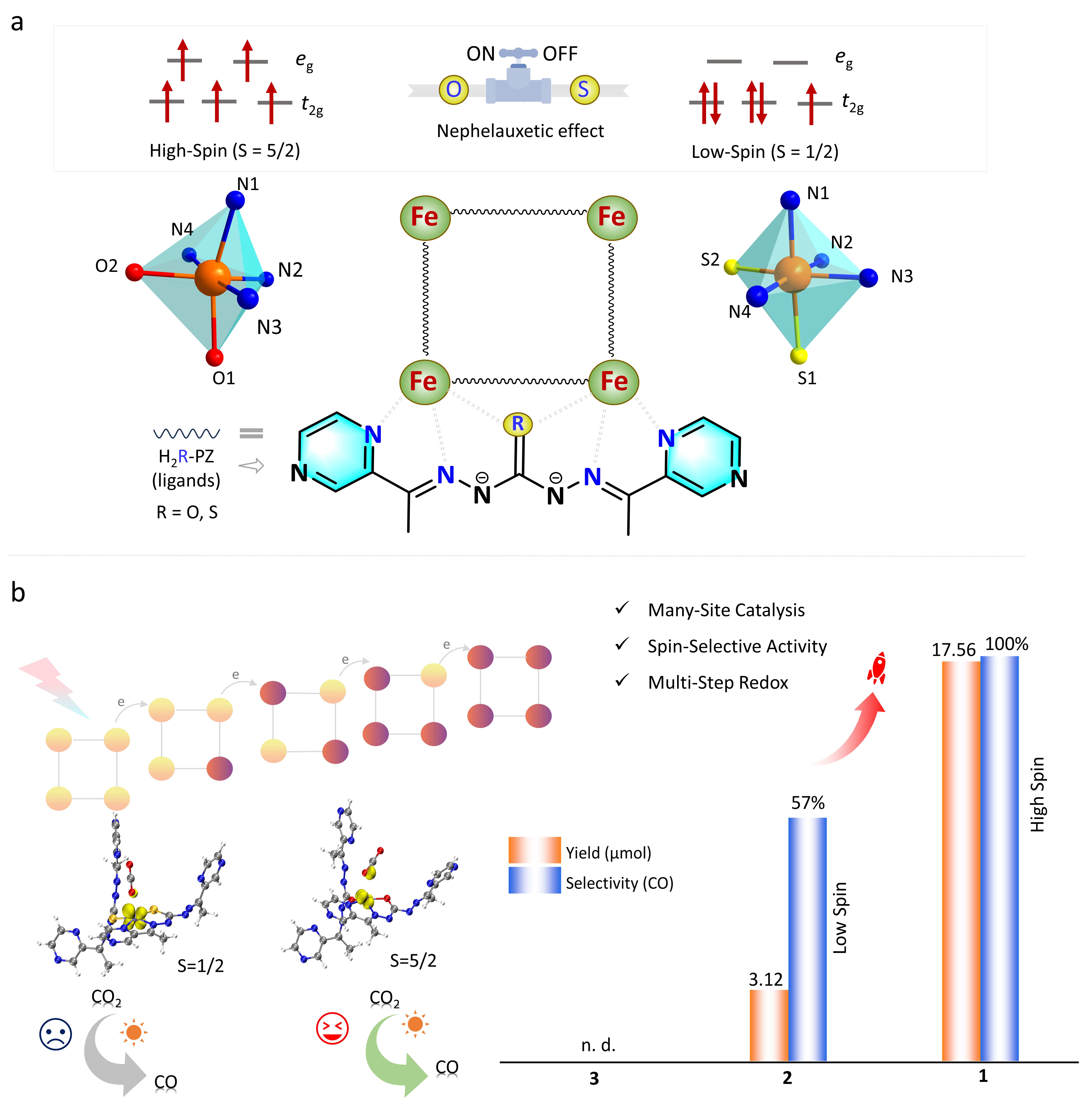 圖2. Fe4團簇中的自旋態(tài)調(diào)控的電子轉(zhuǎn)移機制增強CO2光還原性能的設(shè)計路線