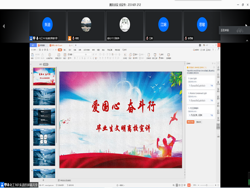 學(xué)院精心為每位畢業(yè)生制作畢業(yè)紀(jì)念優(yōu)盤,表達(dá)學(xué)院對畢業(yè)生的殷殷期盼,望石化學(xué)子奔涌前行;畢業(yè)學(xué)子創(chuàng)作畢業(yè)歌曲《化說再見》,記錄別樣青春時(shí)光;畢業(yè)典禮嚴(yán)肅活潑,讓畢業(yè)生擁有難忘且珍貴的記憶;考研宿舍感恩活動傳遞正能量,難忘宿管阿姨、食堂阿姨的關(guān)懷照顧;畢業(yè)班會憶往昔話今朝,師生情深,不說再見;考研學(xué)霸班級勵志成長,激勵石化學(xué)子乘風(fēng)破浪;“青年講師團(tuán)”畢業(yè)文明離校宣講活動,傳遞愛國情,砥礪奮斗行;誠信教育線上活動,學(xué)生感恩資助,自立自強(qiáng);畢業(yè)班黨員學(xué)習(xí)經(jīng)驗(yàn)分享,不忘初心,揚(yáng)帆遠(yuǎn)航;考研經(jīng)驗(yàn)交流,站在學(xué)長學(xué)姐的肩膀,逐夢前行。